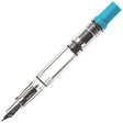 TWSBI Eco Fountain Pen with cerulean blue cap and barrel end. Clear 'demonstrator' barrel reveals the filling mechanism, a built-in piston-filler with a very smooth action. Chromed metal trim and pocket clip. TWSBI logo nicely finishes the top of the pen's cap. Rubber o-ring on cap thread ensures an airtight seal to prevent ink drying out in the pen, whilst also ensuring that the cap is firmly attached to the pen when not in use.