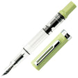 TWSBI Eco Fountain Pen with delicious matcha green cap and barrel end. Clear 'demonstrator' barrel reveals the filling mechanism, a built-in piston-filler with a very smooth action. Chromed metal trim and pocket clip. TWSBI logo nicely finishes the top of the pen's cap. Rubber o-ring on cap thread ensures an airtight seal to prevent ink drying out in the pen, whilst also ensuring that the cap is firmly attached to the pen when not in use.