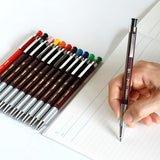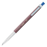 Classically-styled 2mm clutch pencil from Mitsubishi Japan. Traditional Mitsubishi dark red barrel in tough plastic, with knurled metal grip section and chromed metal nose and (removable) pocket clip.
