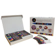 Set contains 2 each of black and white in each size, plus yellow, orange, blue, green, pink, violet, light blue and red.