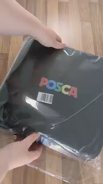 Assorted set of 54 POSCA markers in a POSCA case. Water-based pigment ink markers. Writes on virtually any surface with no bleed through on paper. Polyester bullet-shaped nib.