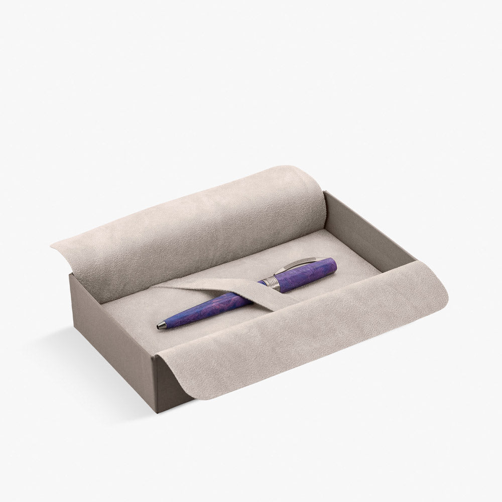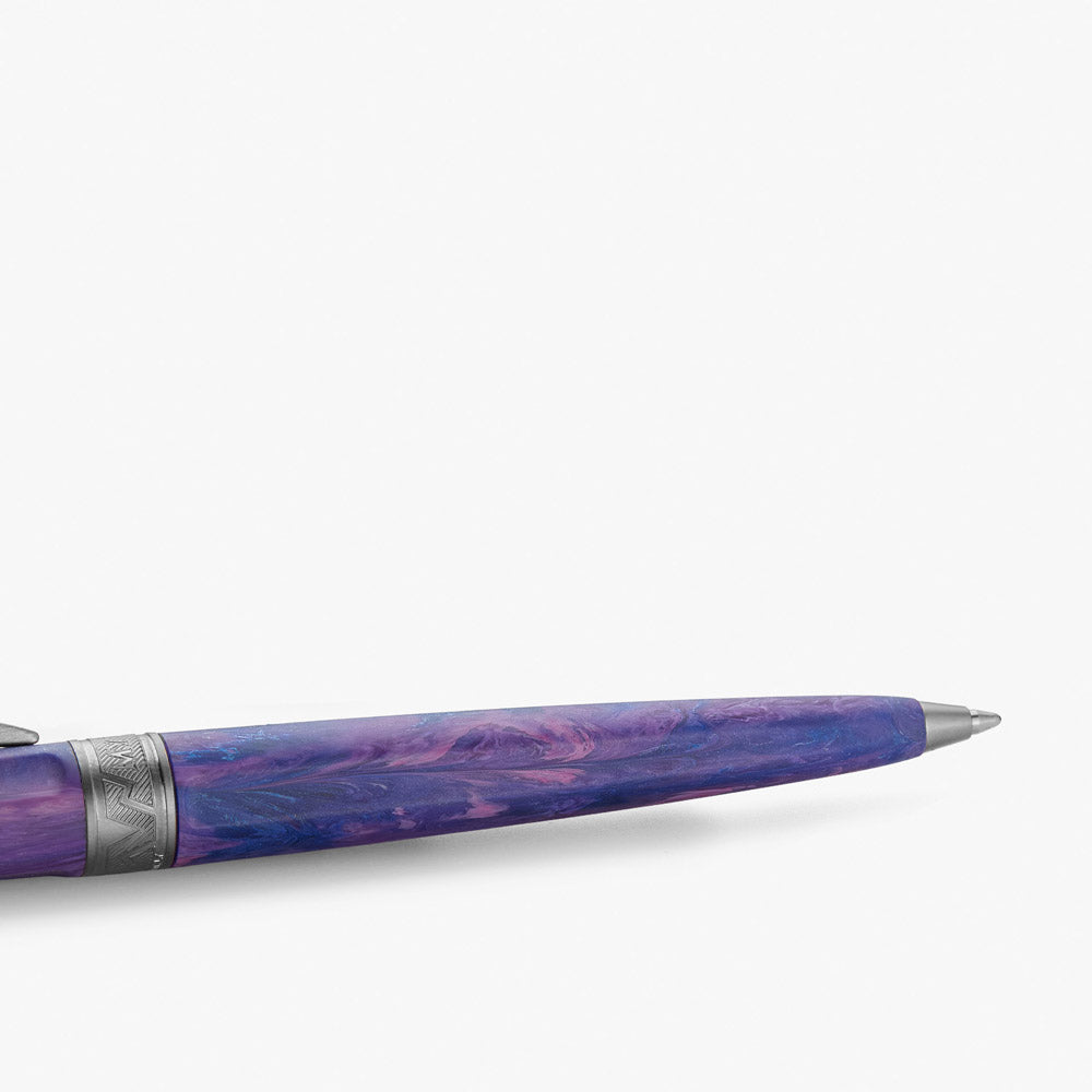 Variegated purple resin barrel with dark blue mixed in to evoke the duality of Persephone's life, split between the heavens and Earth, and the darkness of the underworld.