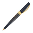 Variegated resin barrel in shades of dark blue. The variegation, together with the grooves in the barrel, add an element of depth to the finish, which is elegantly complemented by the satin gold-plated brass trim.