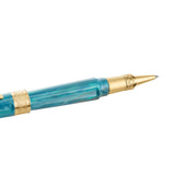 Variegated resin barrel in shades of turquoise. The variegation, together with the grooves in the barrel, add an element of depth to the finish, which is elegantly complemented by the satin gold-plated brass trim.