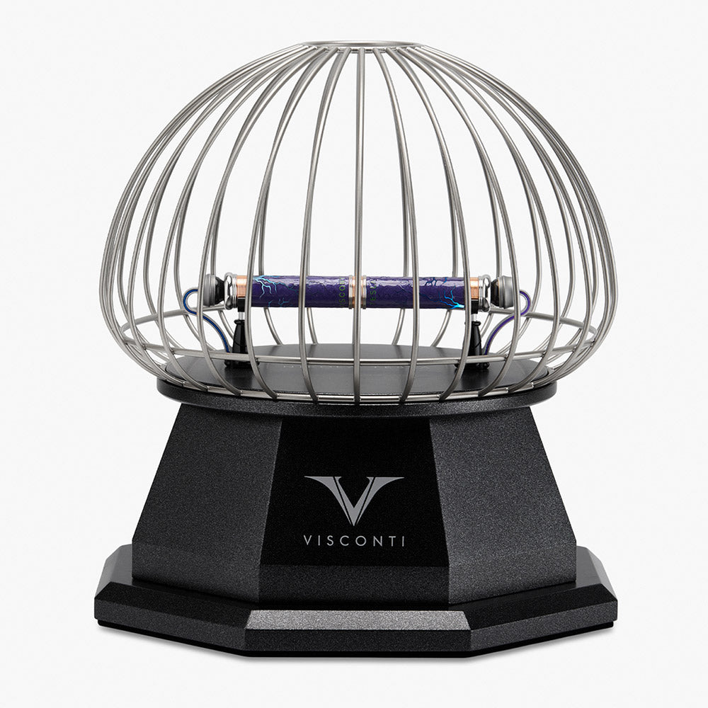The supplied pen stand is modelled after a Tesla tower, with the pen held in place over a beam of light that activates the fluorescence, making the lightning glow. The lightning isn't real, but a Faraday cage over the pen keeps you safe, just in case.