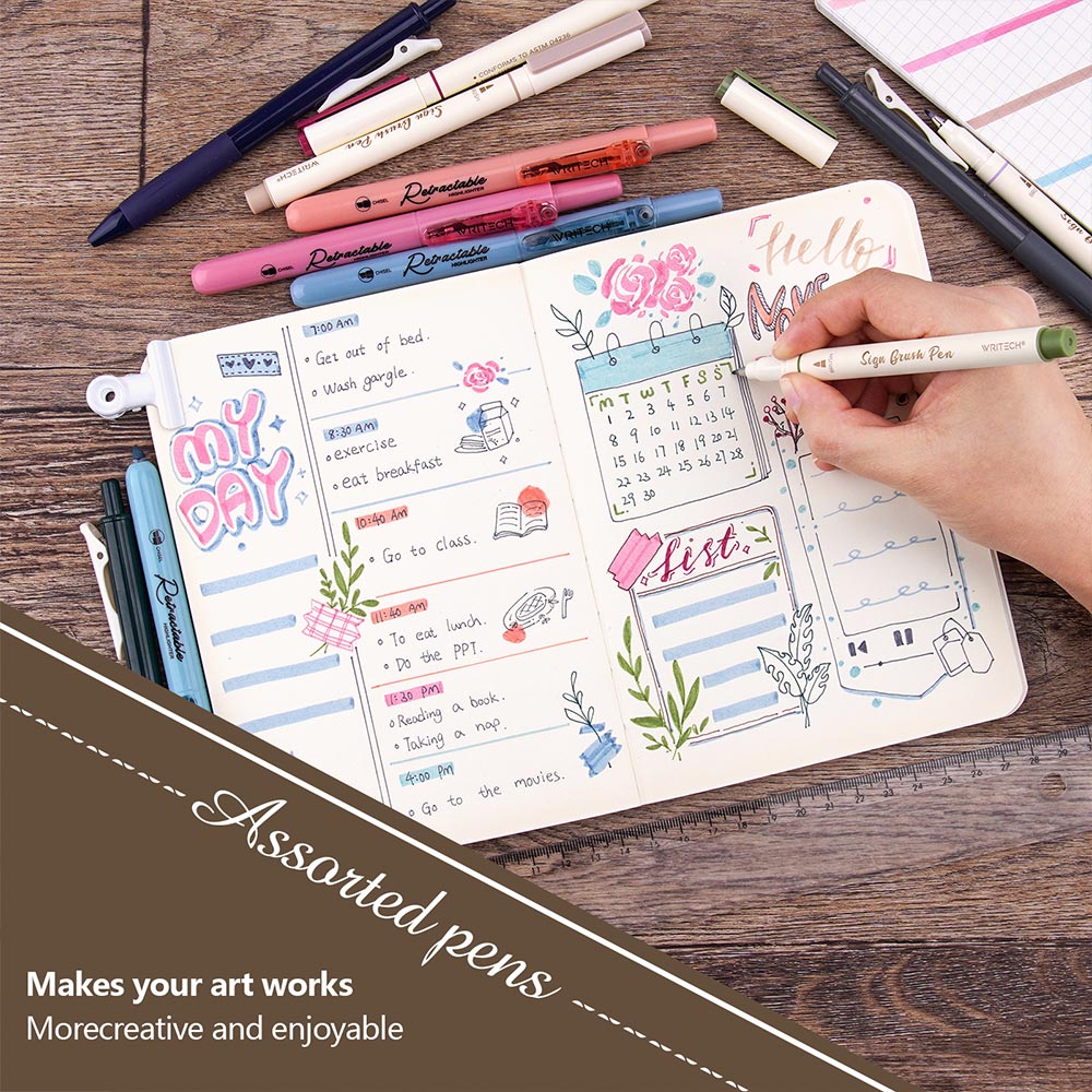 Available in two themes - Mild and Vintage - this Journal Set contains a useful selection of different pens in assorted colours, aimed specifically at journaling. Each set features 4 gel pens, 4 retractable highlighters and 4 sign pens.