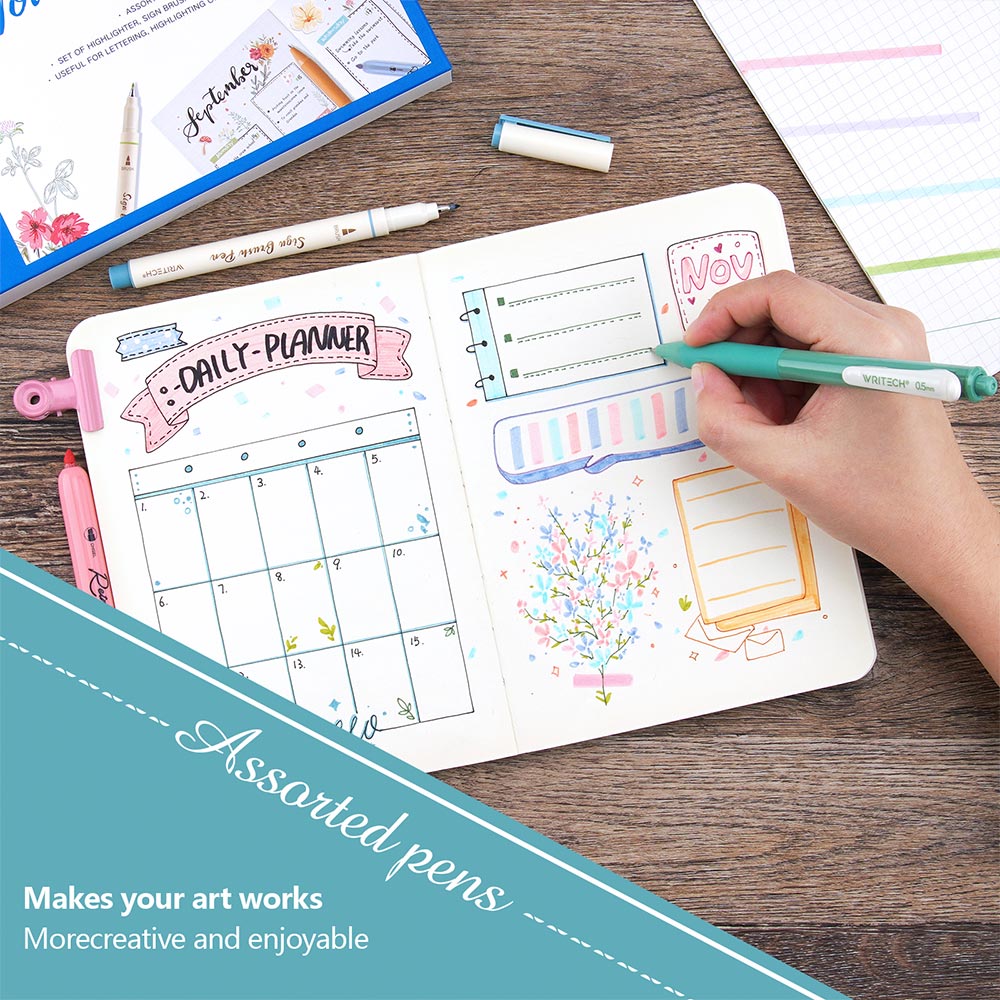 Available in two themes - Mild and Vintage - this Journal Set contains a useful selection of different pens in assorted colours, aimed specifically at journaling. Each set features 4 gel pens, 4 retractable highlighters and 4 sign pens.