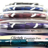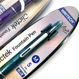 This Retractable Fountain Pen features a medium nib which extends and retracts at the touch of the push-button. A tiny door flips open to reveal the nib, and closes securely to protect from damage and prevent the ink drying out. Features a pocket clip and a choice of transparent barrel colours.