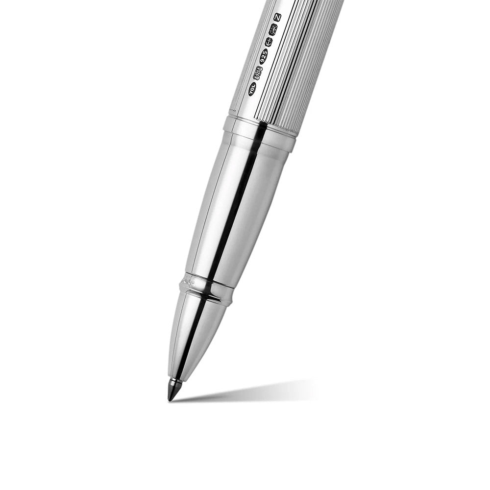 Rollerball pen with hand-applied 'Pinstripe' pattern, reminiscent of the classic style of British suit. 72 pinstripes are hammered into the barrel using machines that date back to 1857.
