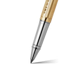 Rollerball pen with hand-applied 'Pinstripe' pattern, reminiscent of the classic style of British suit. 72 pinstripes are hammered into the barrel using machines that date back to 1857. Vermeil finish - a gold coating over Sterling silver metal. Supplied in a quality gift box.