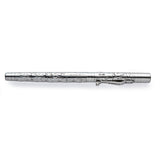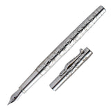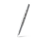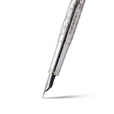 Fountain pen with hand-applied 'Victorian' pattern on each side. Each pen will be slightly different, as the pattern is hand-applied by a silversmith, with up to 3,000 taps to hammer the chasing into the pen's body. 18-carat gold nib, plated to match the pen's silver finish. Supplied in a luxury gift box.